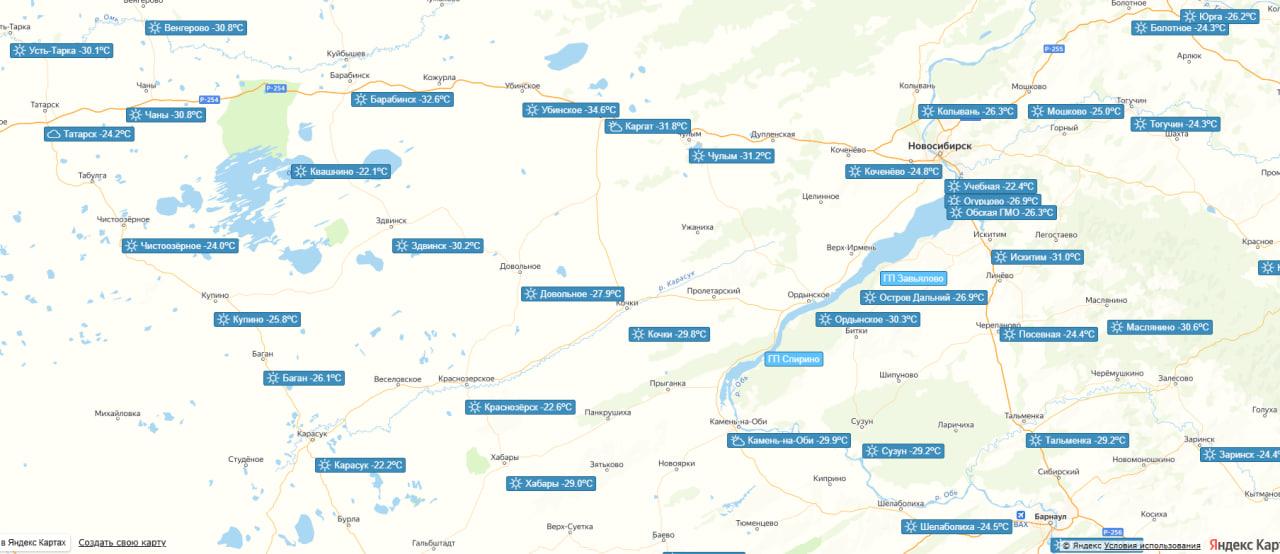 Менее интенсивным похолодание было в Карасуке, Купино и Чистоозерном, где температура не опускалась ниже -25 градусов. В Новосибирске показатели варьировались от -22,4 до -26,9°C в зависимости от метеостанции. В соседнем Искитиме оказалось холоднее — там воздух остыл до -31 градуса.