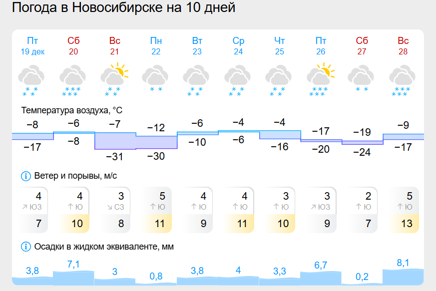 На следующей неделе в Новосибирске ожидается похолодание до -32 градусов, снег может выпадать ежедневно. Самой теплой обещает быть среда, а самой холодной — пятница. Рассмотрим прогнозы трех метеорологических сервисов для жителей города.