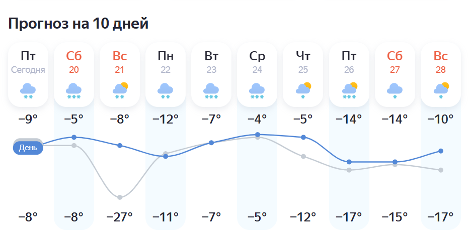 Согласно «Яндекс Погоде», в течение недели дневная температура составит от -4 до -14 градусов, ночная — от -5 до -17. Снег разной интенсивности будет идти все дни. Максимальное потепление прогнозируется на среду, а минимальные температуры — на пятницу.