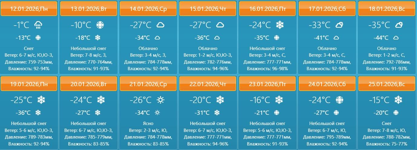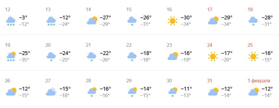 «Яндекс.Погода» сообщает, что начало недели будет относительно теплым: в понедельник днем около -3 градусов. Однако 16 января днем похолодает до -30 градусов, а ночью 17 января температура снизится до -34 градусов.